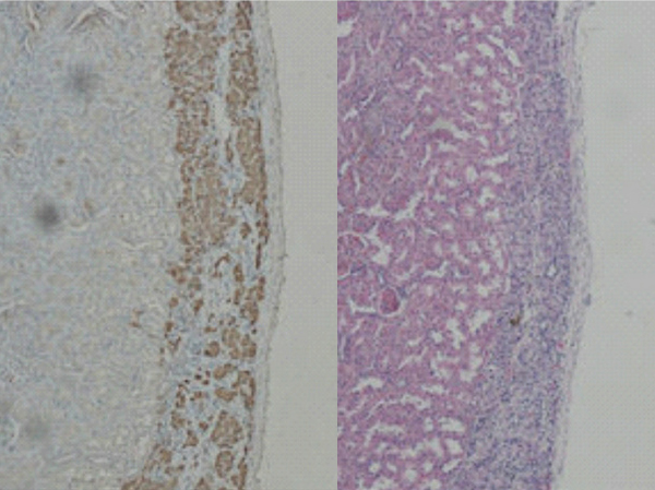 上圖為腎被膜下移植的大鼠胰島HE和免疫組合化染色結(jié)果。